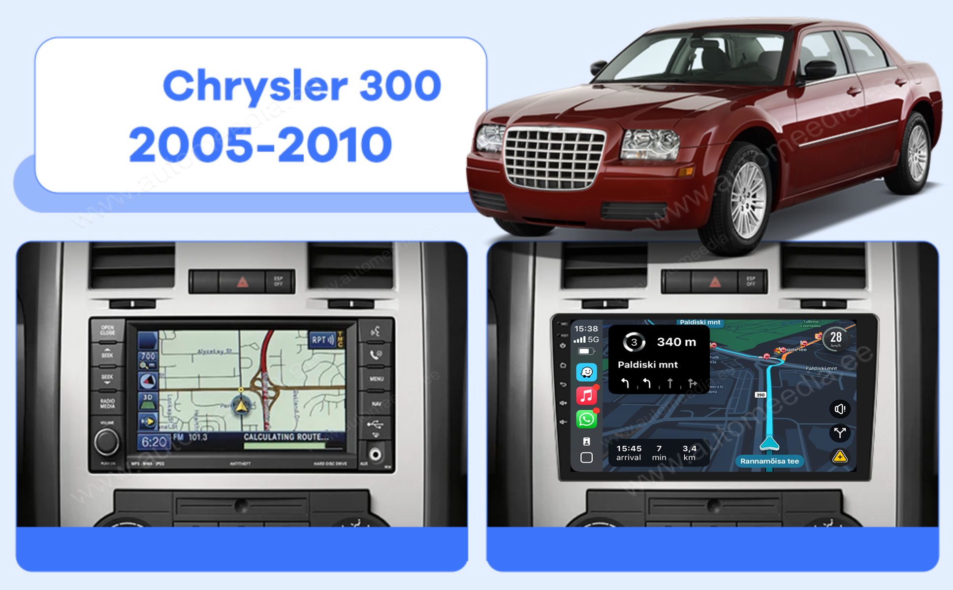 Autoraadiole on sisseehitatud Apple CarPlay (juhtmevaba) ja android telefonidele Android Auto (juhtmega) funktsioon. Ühenda oma telefon meediakeskuse USB kaablile ja too CarPlay rakendused naviraadio ekraanile. Äpid töötavad sinu telefonis, pilt kuvatakse meediakeskuse ekraanile..