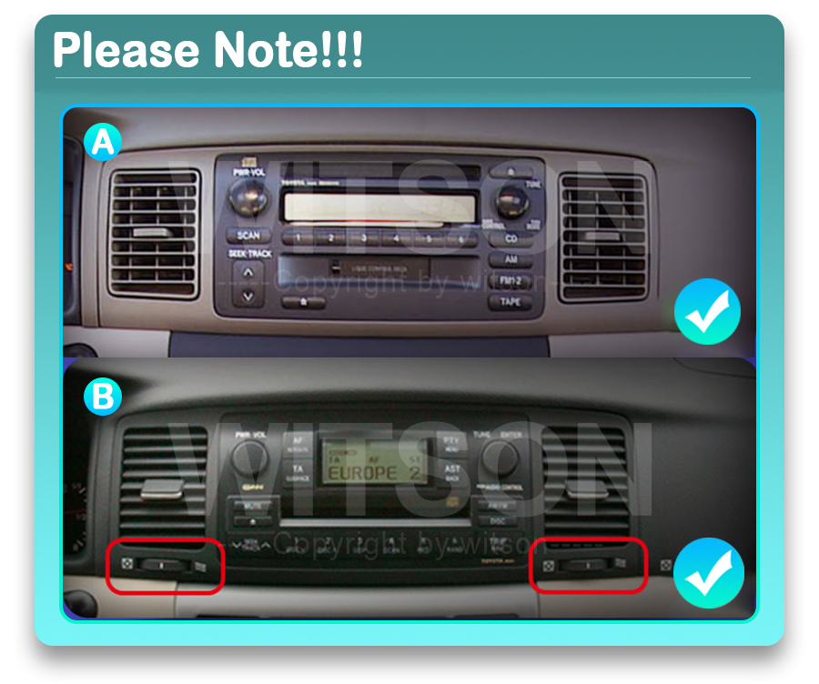 Toyota Corolla (2000-2006) – XTRONS XTR9158 multimeedia keskus ühildub otse auto originaal-pistikutele ja on kuju poolest disainitud täpselt originaalraadio sarnane. Seetõttu ei nõua paigaldus üleminekuid ega sobitusadaptereid ja raadio installeerimine on üsna jõukohane ka isetegijale. Tasub tähele panna, et kuigi tegemist on auto mudelipõhise mutimeedia raadioga ja üldjuhul sujub paigaldamine kaasaoleva juhtmekomplekti abil, siis teatud juhtudel võib mõne vähemlevinud varustustaseme korral olla vajalik teistsuguse spetsiaalse juhtmekomplekti tellimine. Vaata allpool kirjeldust. Ise paigaldamisel on abiks kindlasti ka YouTube videod, kust hankida nippe originaalraadio eemaldamiseks ja uue paigaldamiseks. Kui sa ei ole toote sobivises päris kindel või soovid raadio ikkagi lasta paigaldada kogenud asjatundjal, siis võta meiega ühendust meilitsi asiakaspalvelu@xtrons.fi - anname sulle meie koostööpartnerite kontaktid (Tallinnas, Pärnus, Rakveres, Tartus, Haapsalus või Helsingis).